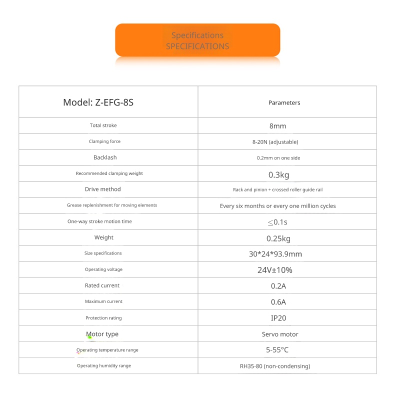 Answer: The gripping force of Z-EFG-8S is between 8-20N, and it can be manually adjusted via the potentiometer on the side of the gripper. The gripping force of Z-EFG-12 is 30N and is not adjustable. The default gripping force of Z-EFG-20 is 80N. If customers require other gripping forces, they can specify this at the time of purchase. The value is set to the customer’s custom specifications before leaving the factory.